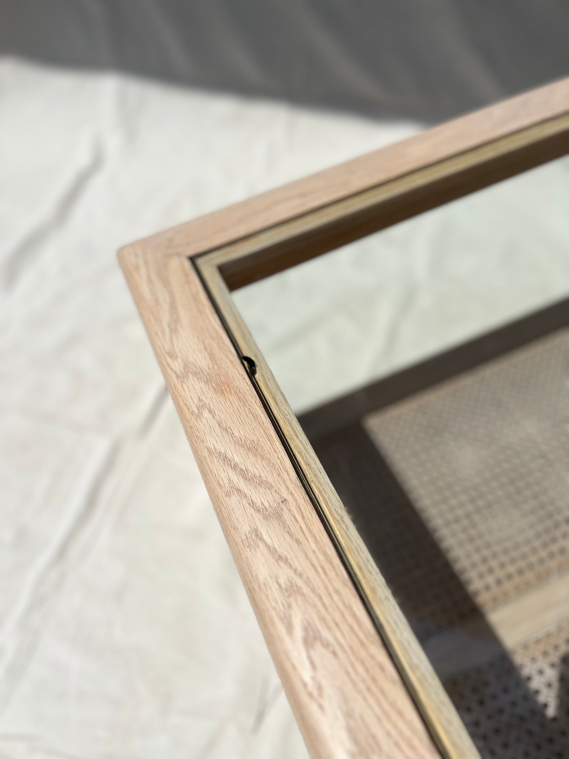 The frame has been hand-sanded and treated in a refined pale oak finish, achieving a light, elegant look that complements both contemporary and classic interiors. Its woven cane shelf adds warmth and texture — perfect for displaying books, baskets, or decor pieces — while the glass top keeps the design open and airy.