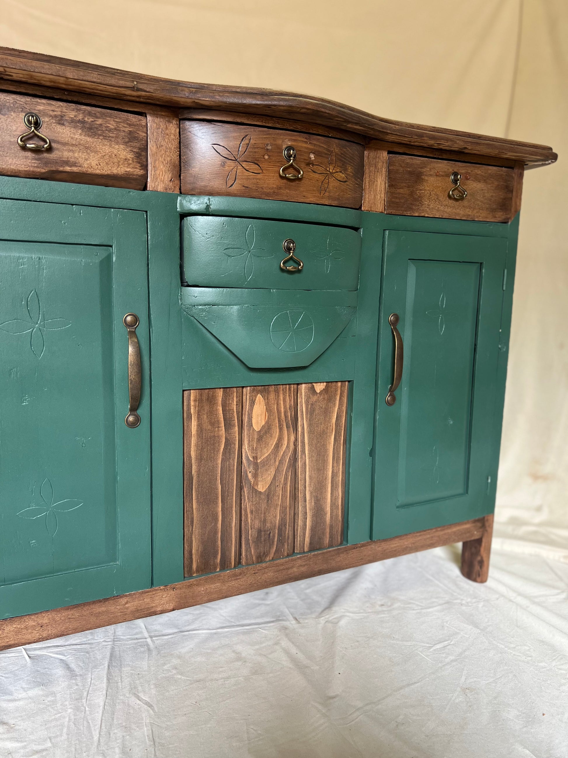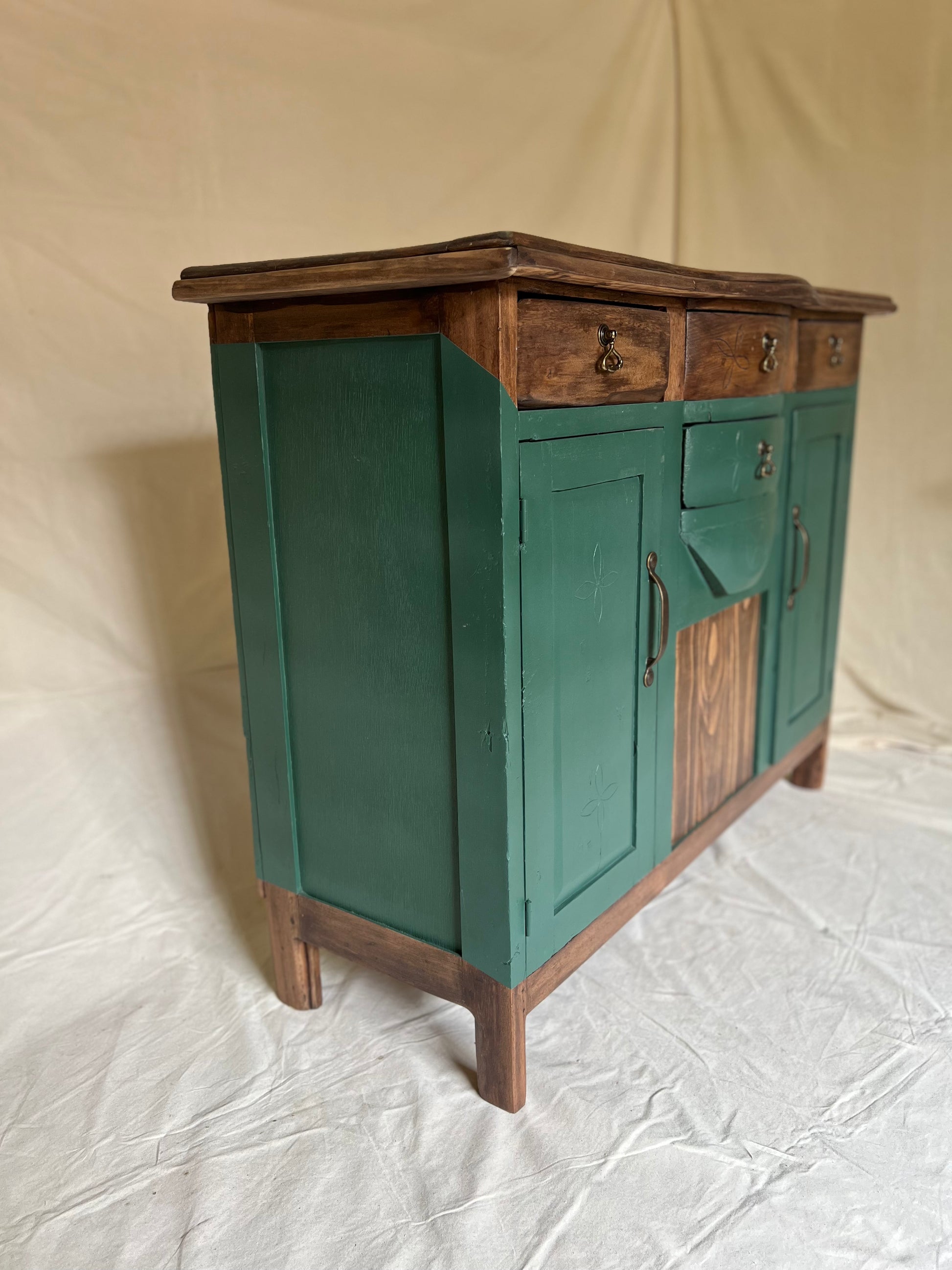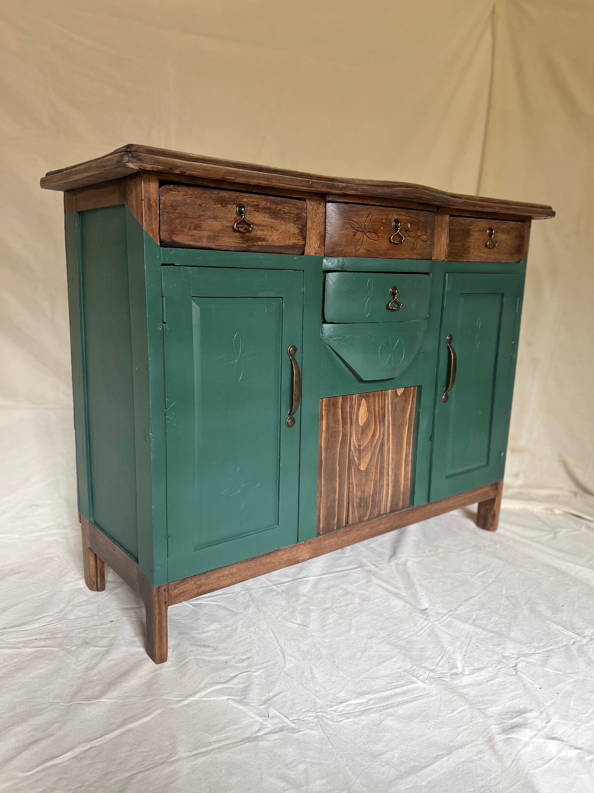 This cabinet has truly lived a life. Once battered, mistreated, and left to endure the wind, rain, and cold, it carries the marks of its journey — even burn scars that whisper of its past. What was once forgotten and broken has now been carefully restored, with every detail treated with patience and respect.